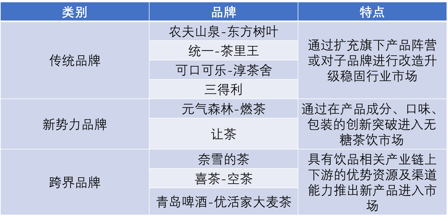 近年來,無糖茶市場進(jìn)入高速發(fā)展期,開始受到國內(nèi)傳統(tǒng)茶飲企業(yè)、新銳茶飲品牌,甚至其他食品飲料企業(yè)的關(guān)注,諸多跨國、跨界企業(yè)紛紛入局。如今,無糖茶市場基本呈現(xiàn)出傳統(tǒng)品牌領(lǐng)跑、新勢力品牌緊隨其后、跨界品牌初出茅廬的發(fā)展格局。