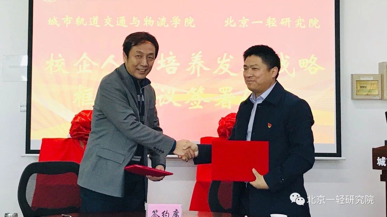 2019年1月16日,北京一輕研究院與北京聯合大學城市軌道交通與物流學院正式簽署了《校企人才培養發展戰略框架協議》,雙方領導為“北京聯合大學人才培養合作基地”與“北京一輕研究院人才培養合作基地”揭牌,雙方就產教融合及具體對接工作展開了深入交流和探討。